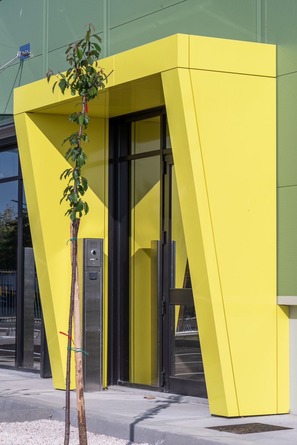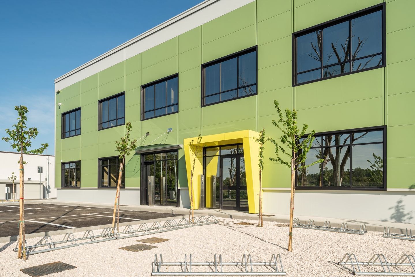 The structure is built entirely with prefabricated reinforced concrete elements and a bac acier roof, featuring a single-span of 35 meters. It stands out from similar buildings for its high-quality finishes, both in the warehouse area and the office spaces.